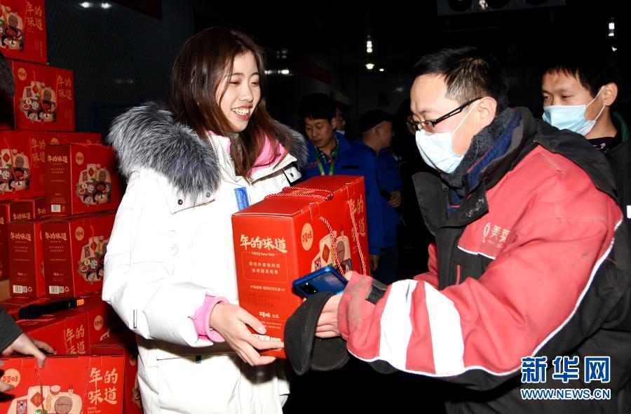 1月31日,在位于北京昌平的一家民營企業糧食蔬菜倉儲車間內,留守崗位、就地過年的員工(右)在領取春節慰問品?! 〈汗潄砼R之際,北