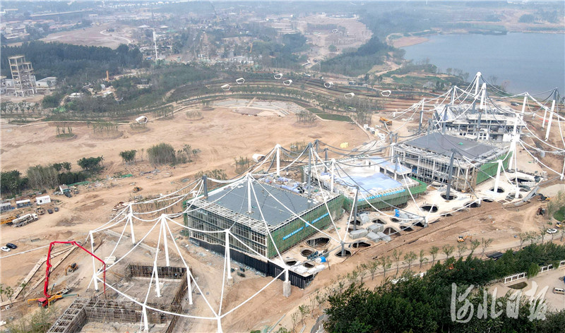2020年7月21日拍攝的河北省第四屆園林博覽會園博園主場館山水邯鄲建設現場。(無人機照片) 目前園博園項目內山水邯鄲、清渠如許、